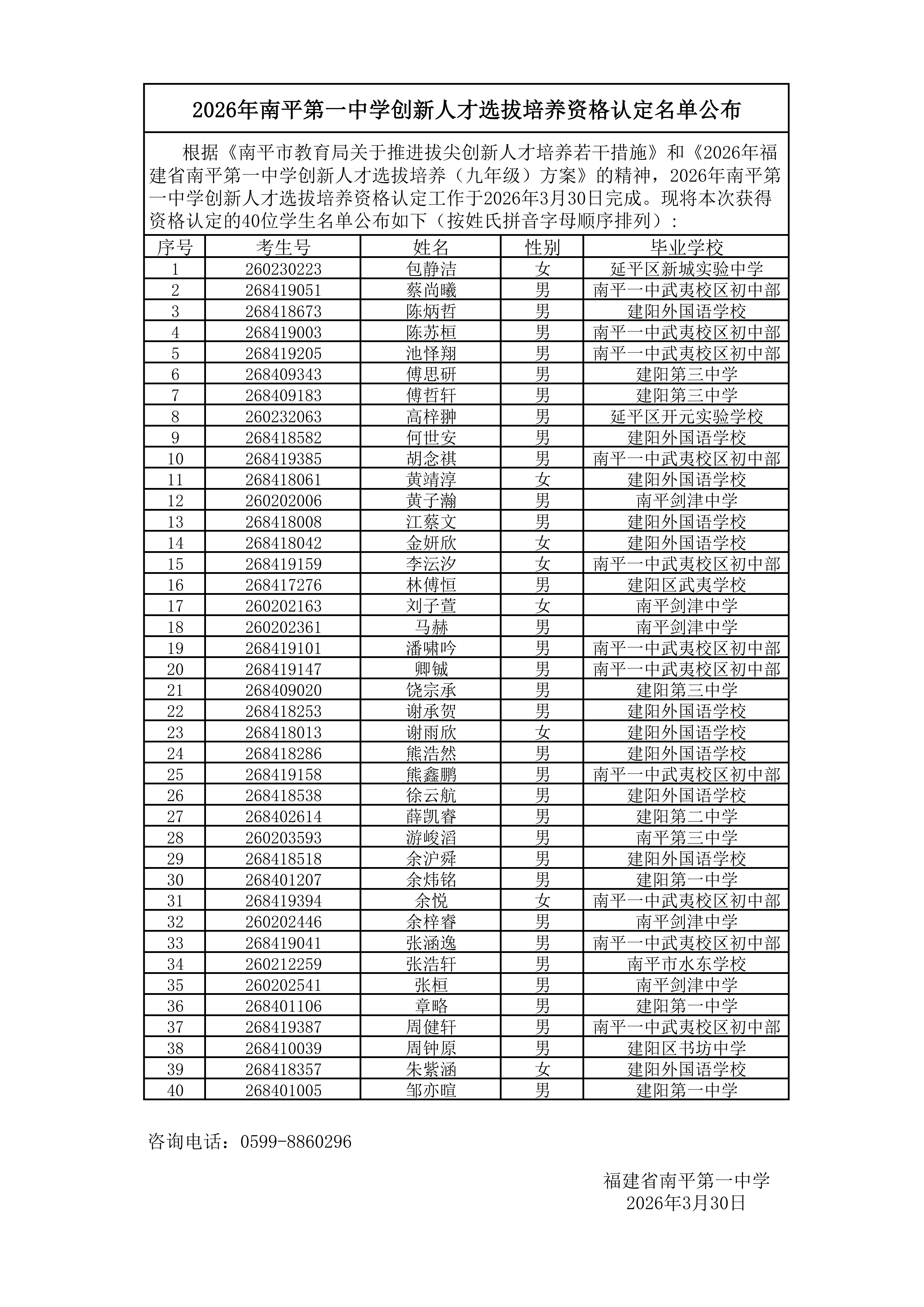 2026年南平第一中学创新人才选拔培养资格认定名单公布