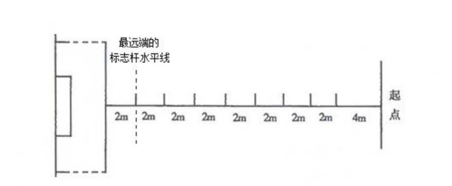 (2)场地器材:大禁区线中点处,取20米长的垂线,以距离大禁区线中点2米为第一标志点,放置标志杆,标志杆高1.5米,标志杆之间距离2米,共8根,详见下图所示。