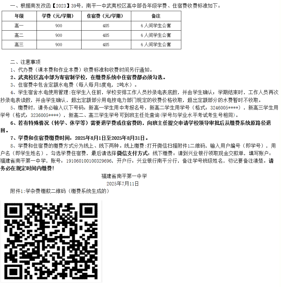 福建省南平第一中学武夷校区高中部2025-2026学年第一学期学杂费缴款通知